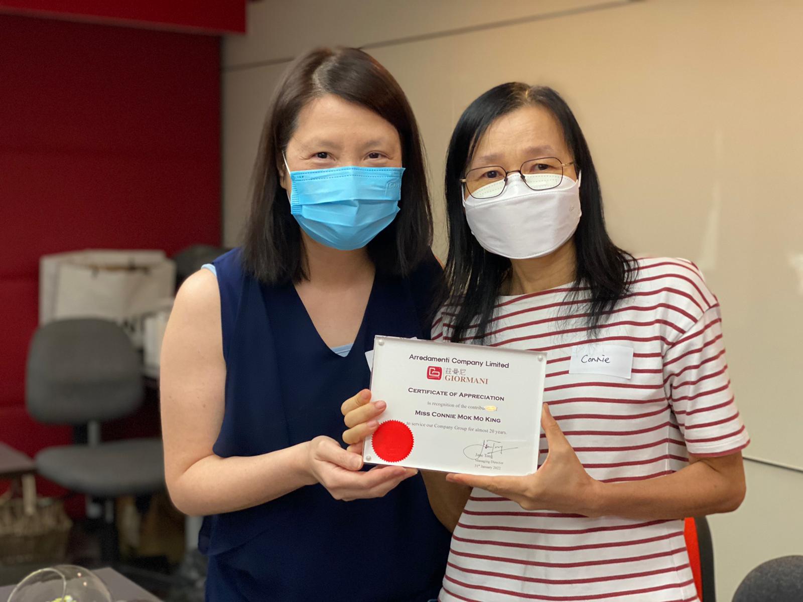歐達集團一路走來,全賴每一位同事的默默耕耘及努力。當中有一位更服務了公司20年,公司特意頒發感謝狀予Connie,以感謝佢於過去多年嘅忠誠,服務和卓越貢獻。
